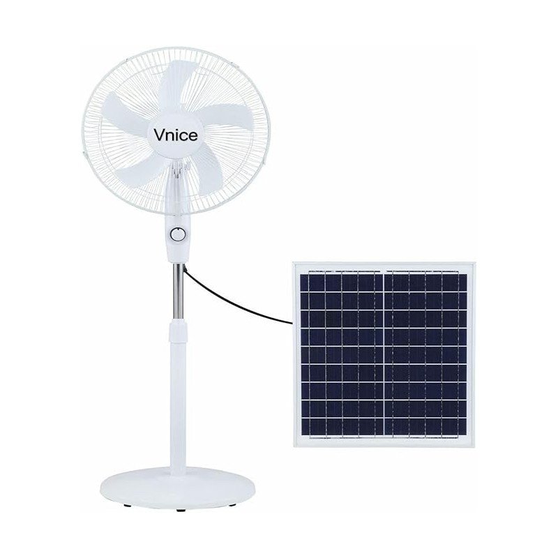 Vnice Solar rechargeable Fan, DC Motor Quiet 16 Inch Pedestal Fan Oscillating Movement Fan Head 3 Speed with Solar Panel Rechargeable Standing Fan for Office Home Outdoor Camping working on both solar and electricity.